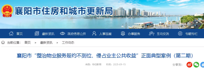 为总结推介襄阳市物业集中整治工作中的好经验、好做法,以点带面发挥示范带动作用,全市发布系列正面典型案例。请全市以本期案例为镜,健全完善共建共治共享工作机制,持续提升物业服务水平和管理能力,切实“整治物业服务履约不到位、侵占业主公共收益等问题”。