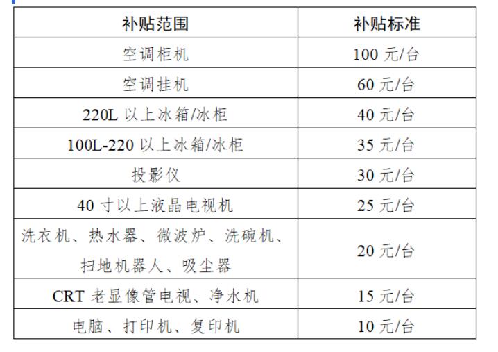 符合条件的补贴产品包括空调、电视机、投影仪、冰箱冰柜、洗衣机、吸油烟机、燃气灶、热水器、微波炉、洗碗机、电饭煲、净水器、空气净化器、扫地机器人、吸尘器、智能门锁、智能马桶17类商品。产品须在中国效能或水效标识网备案达一、二级能效,具有统一的国标13位商品编码。