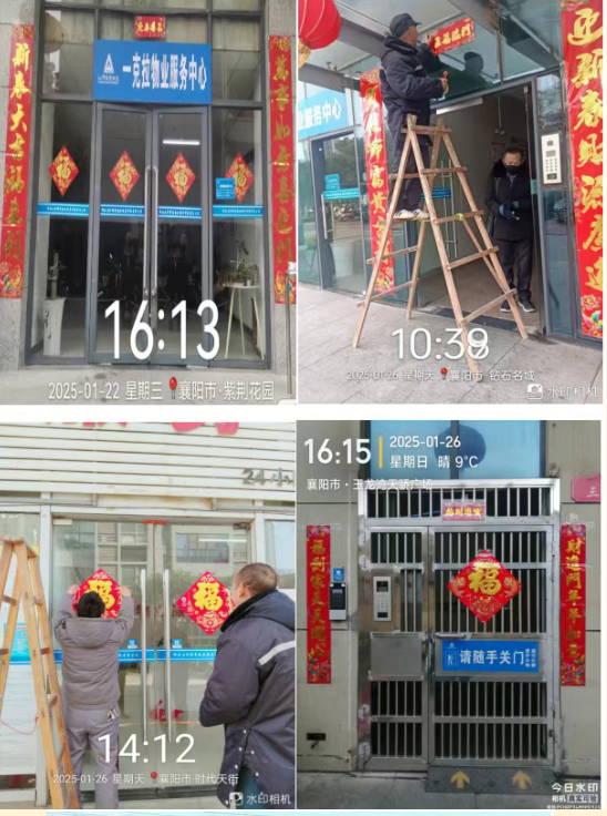 挂满灯笼过大年,贴上春联迎新春,物业工作人员在小区悬挂横幅、在门口及单元门口张贴对联、“福”字,一幅幅春联、“福”字散发着新春喜庆祥和的气息。