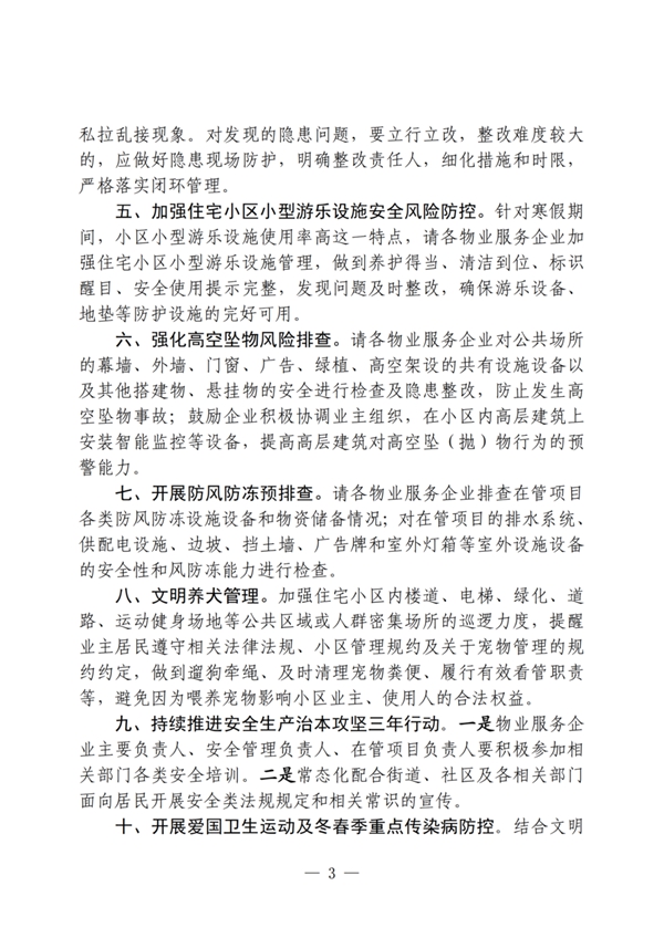 五、加强住宅小区小型游乐设施安全风险防控。针对寒假期间,小区小型游乐设施使用率高这一特点,请各物业服务企业加强住宅小区小型游乐设施管理,做到养护得当、清洁到位、标识醒目、安全使用提示完整,发现问题及时整改,确保游乐设备、地垫等防护设施的完好可用。