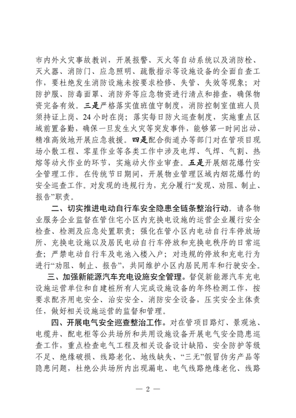 二、切实推进电动自行车安全隐患全链条整治行动。请各物业服务企业监督在管住宅小区内充换电设施的运营企业履行安全检查、检测及应急处置职责;强化在管小区内电动自行车停放场所、充换电设施以及居民电动自行车停放和充换电秩序的日常巡查;严禁电动自行车及电池入楼入户;对违规的停放和充电行为进行“劝阻、制止、报告”,共同维护小区内居民用车和行驶安全。