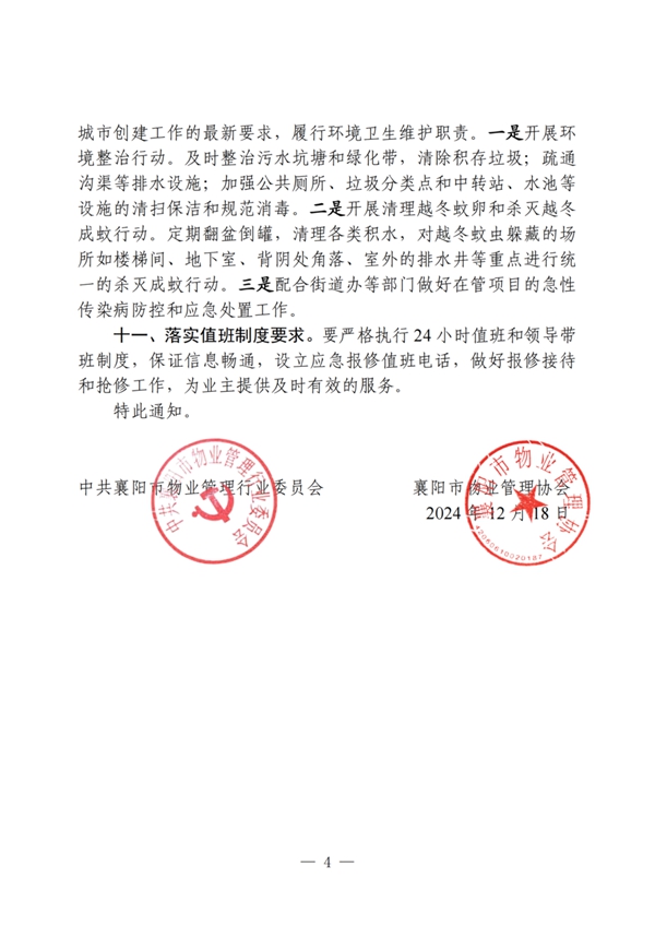 十、开展爱国卫生运动及冬春季重点传染病防控。结合文明城市创建工作的最新要求,履行环境卫生维护职责。一是开展环境整治行动。及时整治污水坑塘和绿化带,清除积存垃圾;疏通沟渠等排水设施;加强公共厕所、垃圾分类点和中转站、水池等设施的清扫保洁和规范消毒。二是开展清理越冬蚊卵和杀灭越冬成蚊行动。定期翻盆倒罐,清理各类积水,对越冬蚊虫躲藏的场所如楼梯间、地下室、背阴处角落、室外的排水井等重点进行统一的杀灭成蚊行动。三是配合街道办等部门做好在管项目的急性传染病防控和应急处置工作。