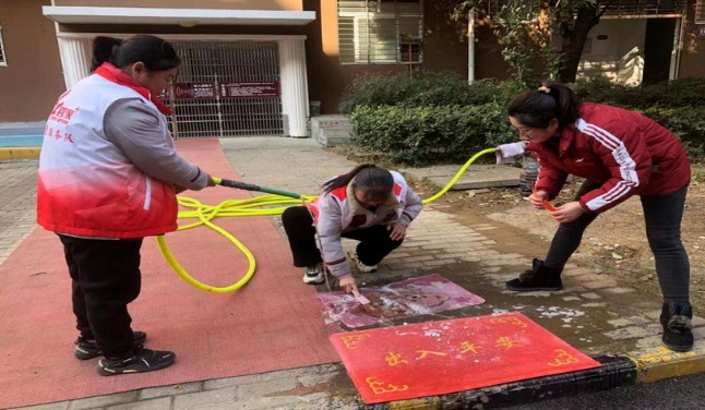 在地垫清洗区,物业工作人员与志愿者分工协作,先用高压水枪对地垫进行全面打湿,接着均匀喷洒清洗液,随后用刷子细致地刷洗地毯每一处,原本污渍遍布的地垫焕然一新。