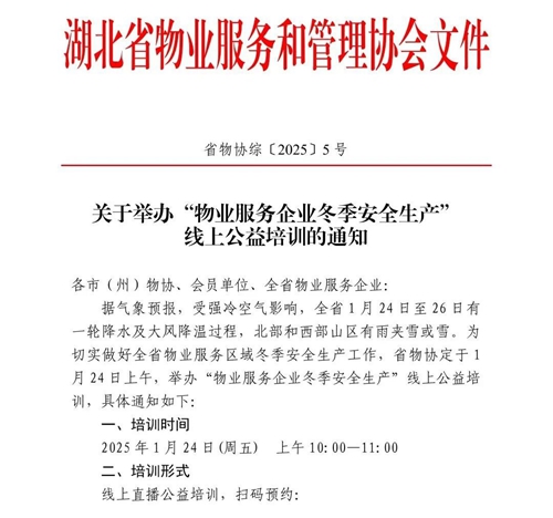据气象预报,受强冷空气影响,全省1月24日至26日有一轮降水及大风降温过程,北部和西部山区有雨夹雪或雪。为切实做好全省物业服务区域冬季安全生产工作,省物协定于1月24日上午,举办“物业服务企业冬季安全生产”线上公益培训,具体通知如下: