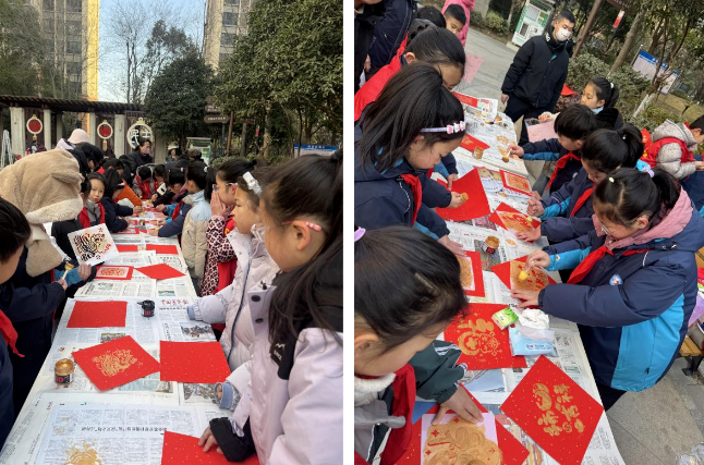 活动现场热闹非凡,物业在小区南大门设置了专门的拓印区域,摆放着精美的工具和材料,邀请工作人员现场指导小福娃们拓印福字。大家围在桌前,兴致勃勃地参与其中。孩子们好奇地触摸着工具,在工作人员的耐心教导下,小心翼翼地完成自己的拓印作品。当一个个鲜艳饱满的“福”字在纸上呈现,大家脸上洋溢着喜悦与自豪。