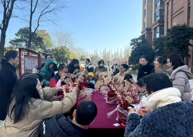 在棉花糖摊位前,人潮涌动,手艺人现场展示棉花糖制作工艺,将白砂糖变成蓬松如云朵的棉花糖。小朋友们通过有序排队和参与元旦知识问答,赢取甜蜜的棉花糖,感受节日的欢乐与幸福。在福桶制作区域,居民们将象征着红火与福气的腊梅、灯笼、福字、柿子等挂件插入福桶,带着满满的福气与好运迎接新年。