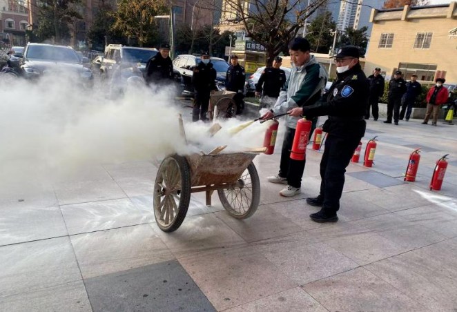 在安保人员成功铺设水带的同时,其他物业各部门工作人员也没有丝毫懈怠。在公司退伍消防人员专业指导下,全员迅速拿起灭火器,拔掉保险销,对准“熊熊燃烧”的模拟火源根部按压把手,白色的干粉如雪花般喷涌而出,精准地覆盖在火焰上。大家紧密配合,形成了一个有序高效的灭火团队,齐心协力与“大火”展开搏斗。
