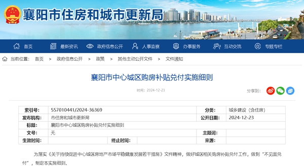2024年12月10日前购买新建商品住房且已完成网签的按《关于进一步做好支持刚性和改善性住房需求工作的通知》(襄住建〔2024〕4号)执行并按相关流程兑付;2024年12月10日及以后购买新建商品住房且已完成网签备案的按《关于持续促进中心城区房地产市场平稳健康发展若干措施》执行并按相关流程兑付。