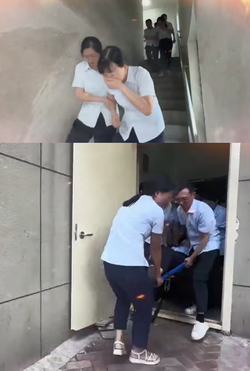 疏散组和救护组迅速就位,引导“被困人员”从安全通道有序逃生,疏散过程,大家弯下身体、捂住口鼻,有序撤离现场。