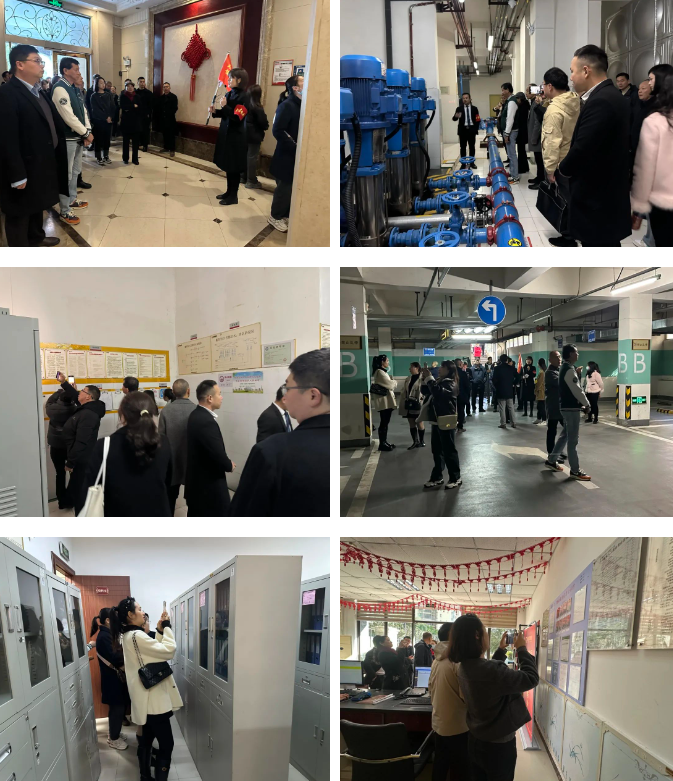 在恒大名都物业工作人员的热情引导下,观摩组一行采取“看、讲、问、谈”结合的方式,依次参观了园区楼栋、水泵房、地库、消防控制中心、物业服务中心、配电房、文化长廊等物业管理核心区域。每至一处,大家都学标准、找差距,学习借鉴金碧物业各类设施设备的运行、维护、管理等经验成果。