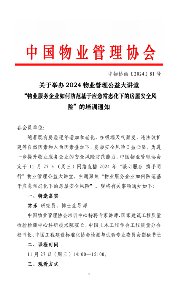 关于举办2024物业管理公益大讲堂“物业服务企业如何防范基于应急常态化下的房屋安全风险”的培训通知