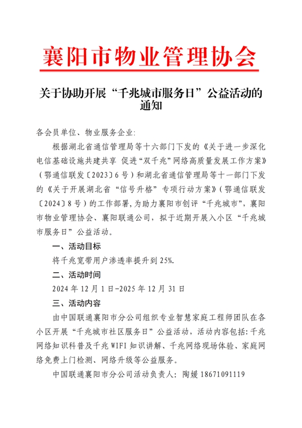 根据湖北省通信管理局等十六部门下发的《关于进一步深化电信基础设施共建共享 促进“双千兆”网络高质量发展工作方案》(鄂通信联发〔2023〕6 号)和湖北省通信管理局等十一部门下发的《关于开展湖北省“信号升格”专项行动方案》(鄂通信联发〔2024〕8 号)的工作部署,为助力襄阳市创评“千兆城市”,襄阳市物业管理协会、襄阳联通公司,拟于近期开展入小区“千兆城市服务日”公益活动。