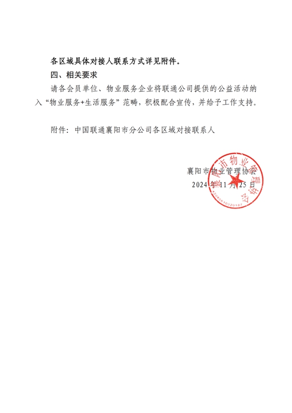 请各会员单位、物业服务企业将联通公司提供的公益活动纳入“物业服务+生活服务”范畴,积极配合宣传,并给予工作支持。