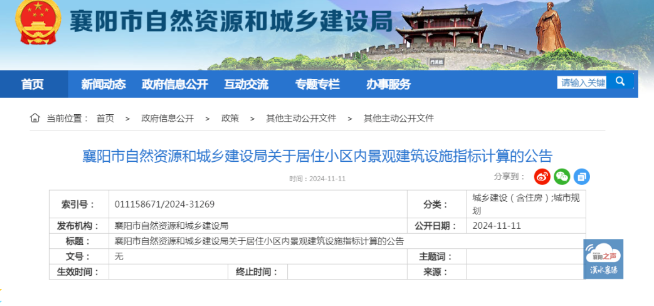 为加快推进我市高品质住宅建设,提升城市品质,改善人居环境,为居民提供丰富多样的公共活动空间。经研究,襄阳市自然资源和城乡建设局现对居住小区内景观建筑设施提出如下规定: