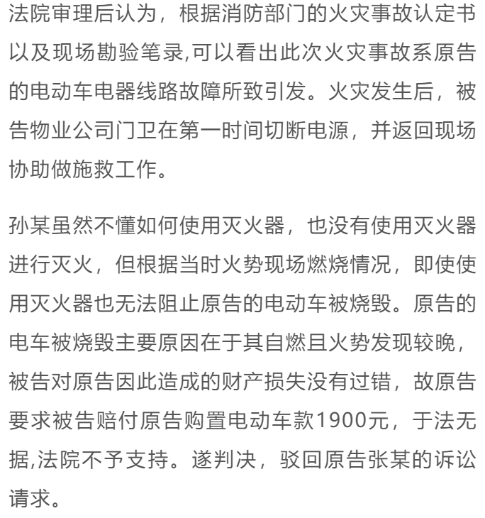 近年来,因电动自行车违规停放、充电或改装引发的火灾事故触目惊心。当电动自行车被烧毁后,谁来承担责任?日前,在一起电动车财产损害赔偿纠纷案件中,法院判决驳回车主要求物业公司承担赔偿责任的诉讼请求。
