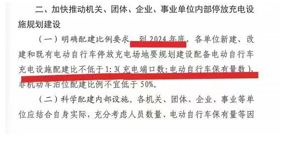 通知要求,到2024年底,各单位新建、改建和既有电动自行车停放充电场地的电动自行车充电设施配建比不低于1:3(充电端口数:电动自动车保有量数),非机动车泊位配建比例不宜低于50%。