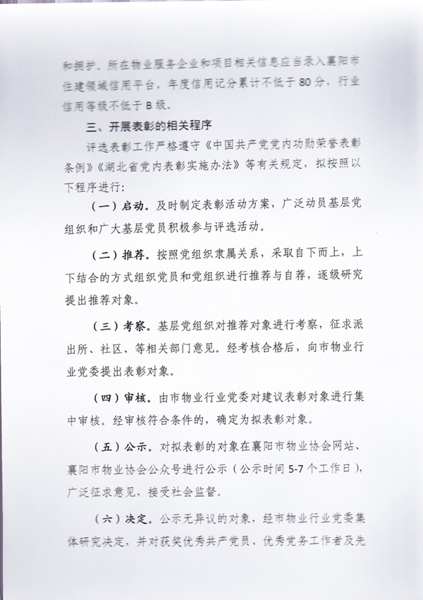 (五)公示。对拟表彰的对象在襄阳市物业协会网站、襄阳市物业协会公众号进行公示(公示时间5-7个工作日),广泛征求意见,接受社会监督。