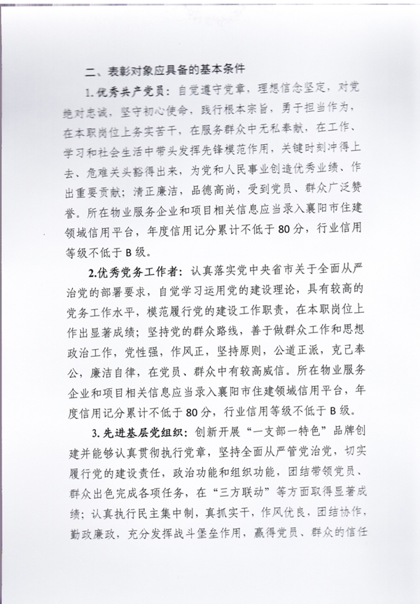 3.先进基层党组织:创新开展“一支部一特色”品牌创建并能够认真贯彻执行党章,坚持全面从严管党治党,切实履行党的建设责任,政治功能和组织功能,团结带领党员、群众出色完成各项任务,在“三方联动”等方面取得显著成绩;认真执行民主集中制,真抓实干,作风优良,团结协作,勤政廉政,充分发挥战斗堡垒作用,赢得党员、群众的信任和拥护。所在物业服务企业和项目相关信息应当录入襄阳市住建领域信用平台,年度信用记分累计不低于80分,行业信用等级不低于B级。