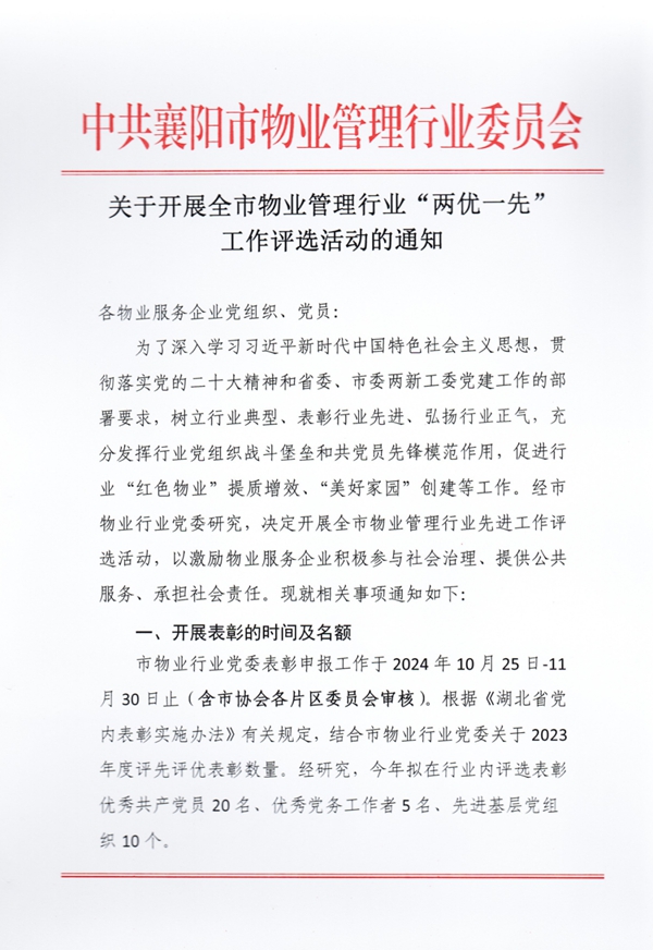 市物业行业党委表彰申报工作于2024年10月25日-11月30日止(含市协会各片区委员会审核)。根据《湖北省党内表彰实施办法》有关规定,结合市物业行业党委关于2023年度评先评优表彰数量。经研究,今年拟在行业内评选表彰优秀共产党员20名、优秀党务工作者5名、先进基层党组织10个。