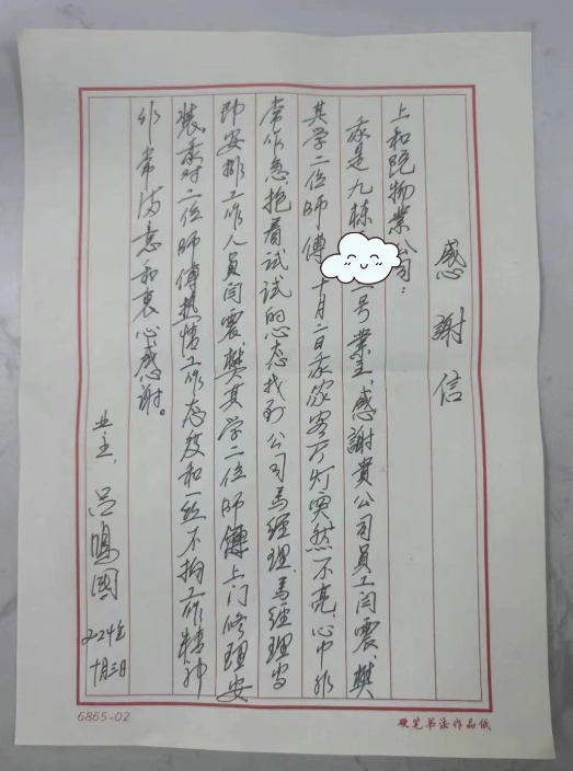 10月8日,业主为李正全送来了一封手写感谢信,表达了自己的感激之情。