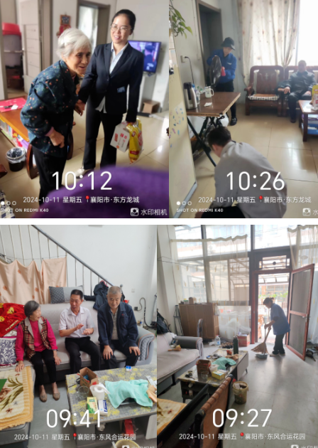 温暖老人心,爱心上门行,重阳节,时代佳苑、一克拉、钻石名城、东方龙城、东风合运花园项目的物业工作人员对小区特殊老人进行了登门拜访,为老人打扫卫生、扫地、擦桌子、整理床铺等,并与老人详细交谈,了解老人的身体情况、生活情况,同时向老人们强调,凡是遇到难以解决的问题或困难都可以联系物业服务中心或向对应的客服管家求助,物业工作人员们一定竭尽所能帮助解决。活动中,他们用物业人的方式表达对小区老年人的关心和爱护,并将一份份精心准备的礼品送至他们手中。