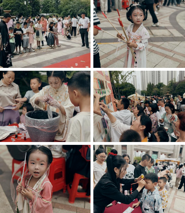 活动开始,大家可以穿上漂亮的汉服打卡拍照,领取精美的漆扇,同时还可以品尝各种美味的小吃和饮品。趣味猜灯谜、投壶和套圈游戏,小朋友们都期待着套中自己心仪的奖品,还有手工制作的小竹花篮灯,非常精致!