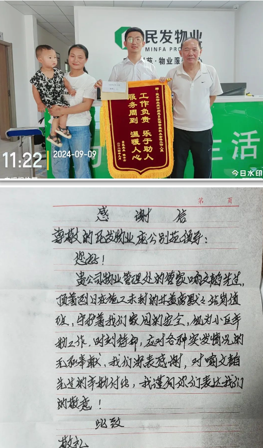 得知秩序班长和楼栋管家的暖心举动后,业主周先生为他们送来了感谢信和锦旗,对民发物业工作人员辛勤付出和无私奉献作出了最高赞誉。