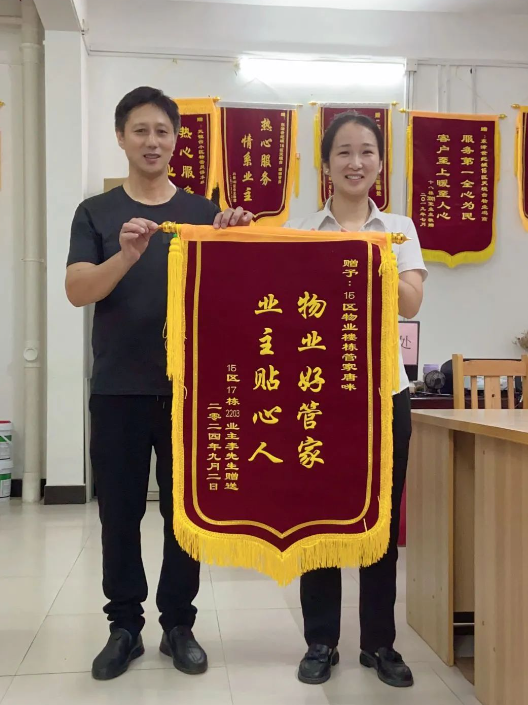 9月1日上午,家住天境台小区的业主李先生将一面“物业好管家,业主贴心人”的锦旗送到了物管员唐咪的手中,向她忠于职守、尽职尽责的工作精神表示深深感谢。