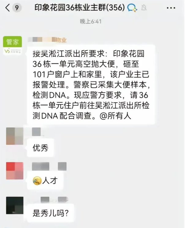 “接吴淞江派出所要求,印象花园36栋一单元高空抛大便,砸至101户窗户上和家里,该户业主已报警处理,警察已采集大便样本检测DNA。现应警方要求,请36栋一单元住户前往吴淞江派出所检测DNA,配合调查。”
