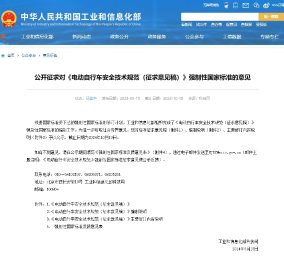 9月19日,工业和信息化部会同公安部、应急管理部等多部门,对最新修订的《电动自行车安全技术规范》进行公开征求意见。