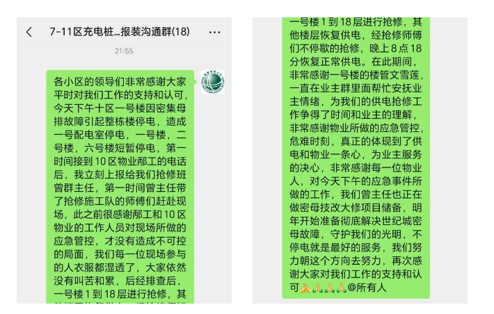在等待电力抢修的时间里,文雪莲与物业中心的同事们为业主们拿来饮用水,安抚业主们的情绪、努力解决业主们的各项需求。而令文雪莲颇为感动的是,没有一位业主向她抱怨、斥责。相反,当晚恢复供电后,业主们纷纷在群里为辛勤抢修的工作人员点赞。