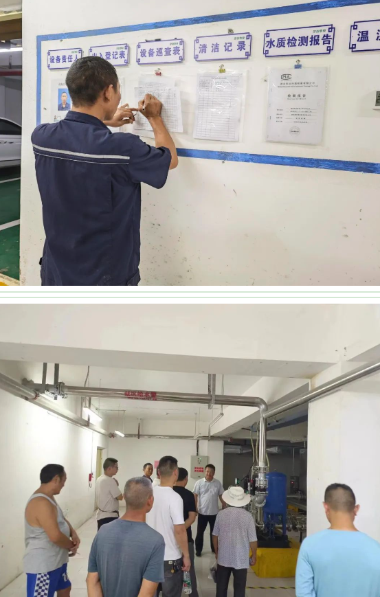 工程师傅耐心的为业主答疑,生活水箱房它担负着高层生活供水的重任,为此,津韵物业工程人员每日巡查,定期保养,确保设备正常运转,保障居民正常生活秩序。看到如此干净整洁、设备齐全的设备房,业主们对小区物业的设施设备管理纷纷点赞。