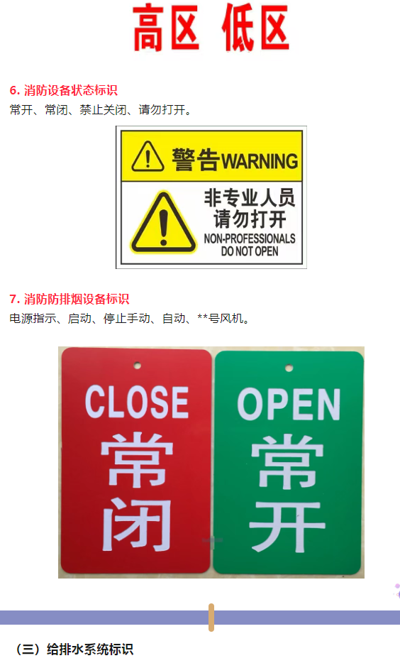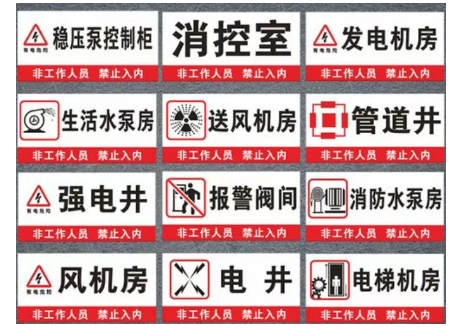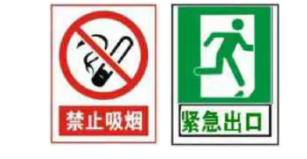 安全出口、疏散通道、禁止吸烟、禁止攀爬、禁止堆放、禁止通行、禁止进入、筑止启动、禁止抛物、注意安全、当心车辆、当心触电、禁止伸入、禁止推动、禁止游泳、禁正止伸出窗外、当心滑倒、禁止触摸、当心碰头、当心跌落、当心落水。