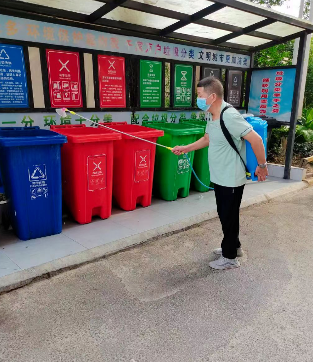 垃圾桶是蚊虫滋生的“育婴房”,保洁人员落实常态化的环境消杀和卫生保洁,每天冲洗擦拭垃圾桶,涓涓清泉,洗净万千尘埃,然后对垃圾桶进行消杀,尽心尽责保持干净整洁的小区环境。