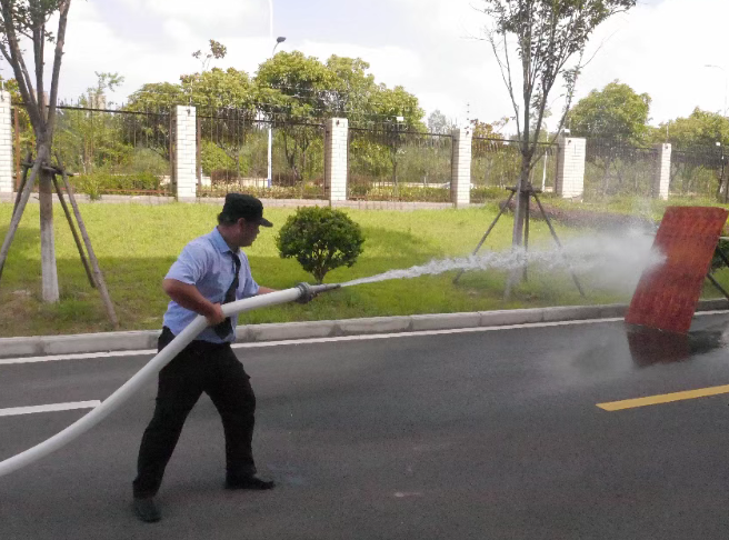 物业消防兵退役的秩序队员细节演示“甩带、连接、开阀、喷水”标准化操作重点及两人协作要点,并讲解灭火器“提、拔、握、压”四步口诀,演示灭火器场景实操。物业、食堂、新入职大学生、未参与过之前消防演练的员工均上手进行了实操,确保全体员工掌握初期火灾扑救技能。