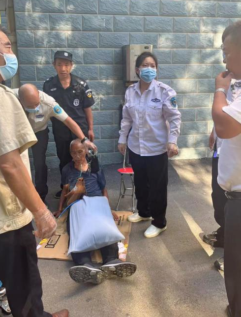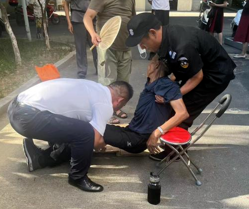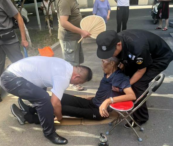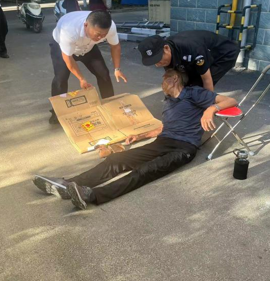 挂断电话,项目经理廖焕俊迅速通知工作人员赶往老人摔倒的地点,到达现场,看到老人躺在地上已无法动弹,立即拨打了120急救电话,通过老人随身携带的水杯上有一个防走丢标识联系到家属,并告知家属老人目前的情况还算稳定,有物业工作人员以及120正在赶来的路上,让家属不要心急,安心的开车。天气炎热,项目经理担心地面太烫老人受不了,赶紧找来纸盒垫在老人身下,一边说话安抚老人的情绪,一边给老人喂水,让老人感受到即使亲人不在身边,也有暖心的物业人在!