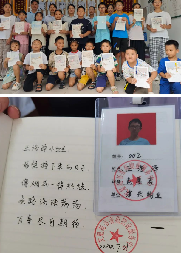 活动节结束,津兴物业工作人员给每位小朋友精心准备了笔和笔记本,收到礼物的小朋友们都异常的开心,笔记本的首页,还贴心的为每位小朋友写了一段祝福语。亲爱的小朋友们 "关爱未成年人活动"在你们的支持配合下获得了圆满的成功,希望你们的未来像彩虹一样五彩斑斓,快乐成长,前途浩荡,未来可期。