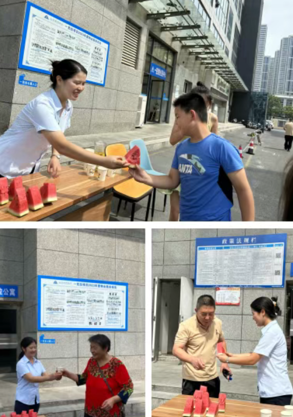 活动现场,工作人员热情地招呼着每一位路过的业主,将西瓜、凉茶等夏日解暑佳品递到业主手中。业主们接过冷饮后,满脸笑容地表达了对物业的感谢之情,认为物业这一举动充分体现了对他们的关心与关爱。