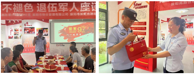 为传承和弘扬尊军崇军、爱军拥军的光荣传统,营造公租房小区拥军优属、关心关爱退役军人的浓厚氛围。7月31日,在中国人民解放军建军97周年来临之际,襄阳市物业管理有限公司党总支下设祥龙·泰然居党支部联合望丰社区、襄阳市长虹北路邮政银行组织开展了“退役不褪色”退伍军人座谈会,15位退役军人、军属欢聚一堂,同庆建军佳节、共叙战友情谊。