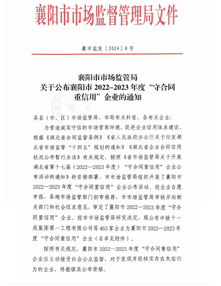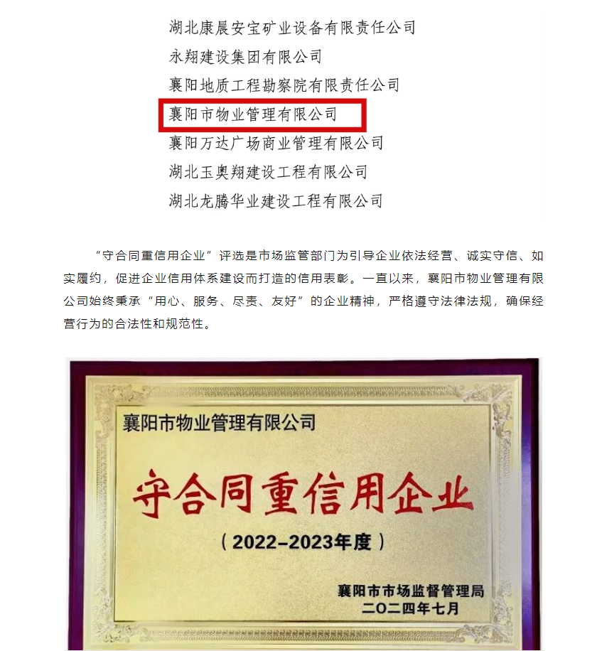 近日,襄阳市市场监督管理局公布了2022-2023年度“守合同重信用企业”名单,襄阳市物业管理有限公司凭借优良的经营信誉和规范的合同信用管理体系,成功获评该称号。