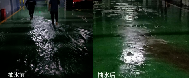正当大家打算缓口气时,东风佳园一期地下停车场顶棚玻璃在暴雨下渗漏导致汛情,大水绕过地库口的沙袋直冲库内,同时导致抽水泵短路跳闸,闻武军会同住宅项目经理、检修人员、物业管家及消防维保单位、电梯维保单位、保安员等人员分配任务,迅速开展抢险工作,经过6个小时的奋战,直到23:00终于将地下停车场积水排空,地下停车场又恢复到干净明亮的面貌,望着那绿色油漆的地面,大家露出了满意的微笑,最后大家对地下停车场4部电梯逐一进行检查,确保安全后大家才放心下班。第二天早晨,又对停车场进行了全面消杀,整个工作才圆满结束。
