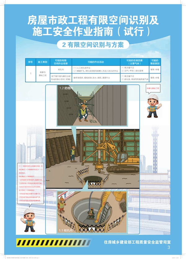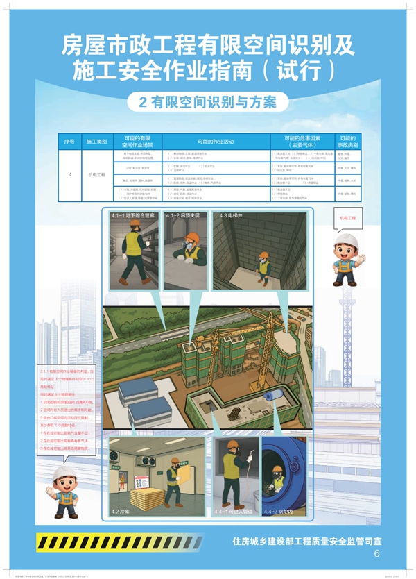 为进一步做好房屋市政工程安全生产管理工作,提高有限空间作业风险识别、安全管控和应急处置能力,住房城乡建设部制定了《房屋市政工程有限空间识别及施工安全作业指南(试行)》,并组织专家编制宣传画册和海报,已由中国建筑工业出版社正式出版发行,供各单位组织学习使用。