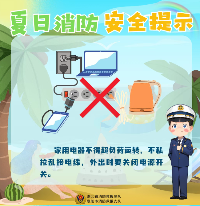 随着夏季的到来,空调、冰箱、电风扇等用电设备大量增加,电气设备线路超负荷运转,电源绝缘皮损坏造成短路打火,或电器的电动机进水受潮,使绝缘强度降低,发生短路烧毁电机着火,还有生产设备升温等。
