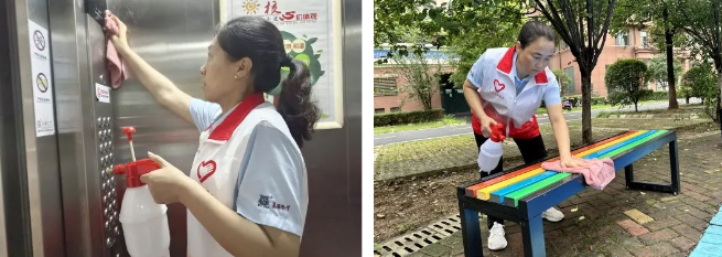 活动中,10余名“双报到”党员及小区志愿者们协同合作,配合默契,一组人对小区内宣传展板、休闲座椅、运动器材等公共设施进行深度清洁,全力恢复小区“本色”,一组人则负责对垃圾桶站、电梯间、单元楼道灯公共区域展开“地毯式消杀”,预防积水引发健康危害。以活动为契机,党员志愿者们还在小区展开了入户走访,向居民一对一宣传了汛后健康卫生知识,了解了居民的真实需求和建议,用心用情用力服务群众,扎实推动“我为群众办实事”落地见效。