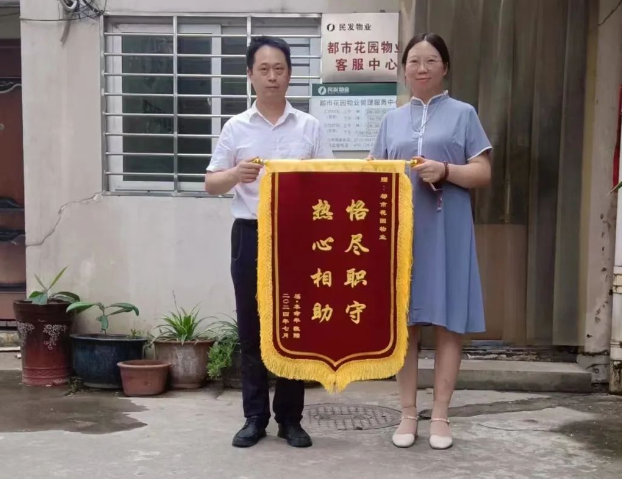 几天后,积水退去,人们的生活恢复了平静。7月18日上午,“本命年”商铺店主带着一面鲜艳的锦旗来到了都市花园物业服务中心,表彰民发物业人暴雨期间的热心相助。