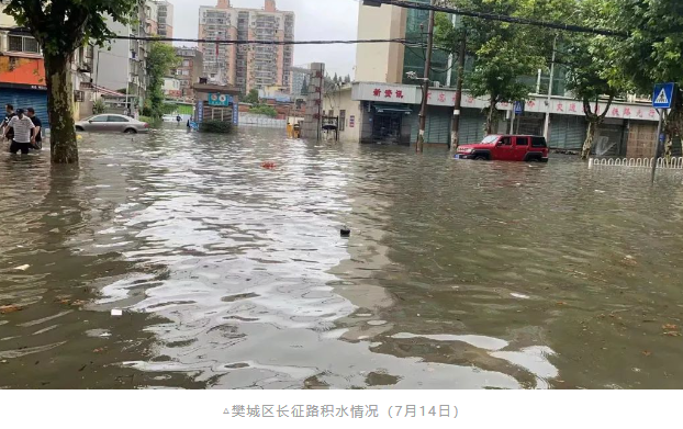 2024年7月14日,樊城区长征路遭遇了严重的暴雨内涝。截至下午时分,路面积水已达到了膝盖以上。