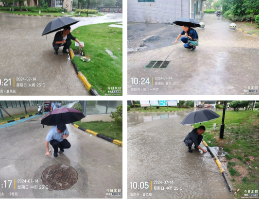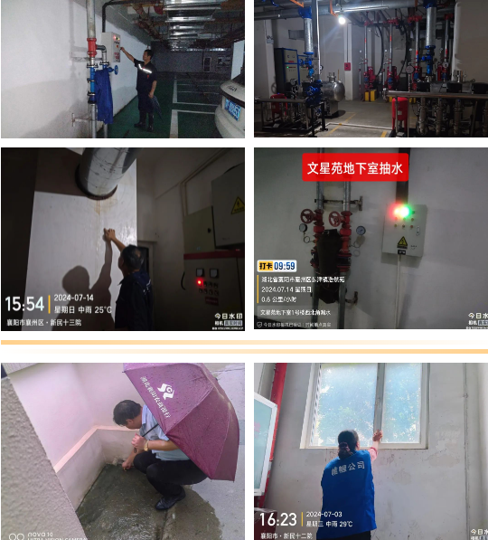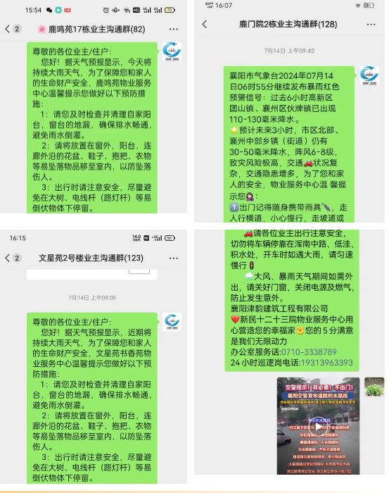 汛情危急,以“时时放心不下”的责任感,通过业主微信群等渠道,及时发布预警信息和温馨提示。各项目工作人员坚守岗位,无惧大雨,对污水井、集水坑、雨水井等一一进行排查,保证雨水能够顺畅排除。对地下车库出入口、地下室及人防、首层出入口逐一检查。同时对各个排水井流入的淤泥杂物进行及时清理,确保有效排水。各项目值班人员24小时不间断巡查,时刻关注汛情动态,确保每一处安全隐患都被及时发现并处理。