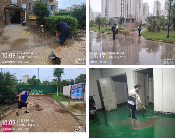 特大暴雨虽已过去,襄阳津韵物业人仍将坚守一线,为您和家人的安全筑起一道坚不可摧的防线。在风雨无阻的坚守中,物业工作人员矢志不渝,持续以实际行动,坚决守护业主的安宁家园。