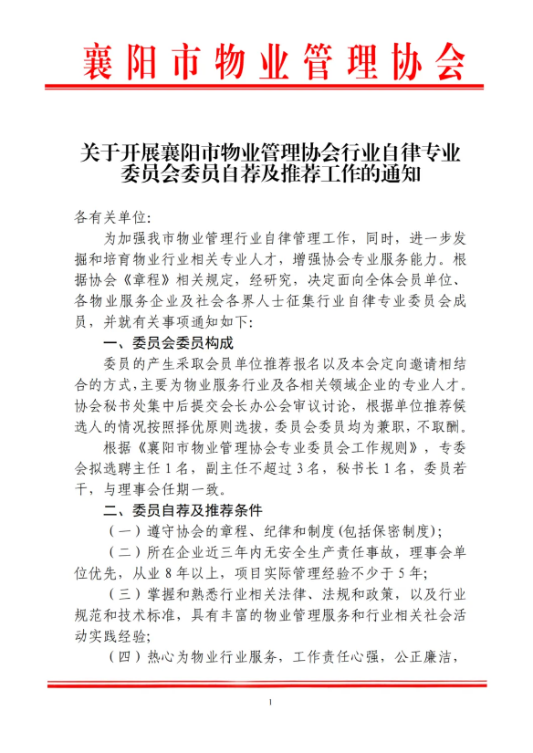 关于开展襄阳市物业管理协会行业自律专业委员会自荐及推荐工作的通知