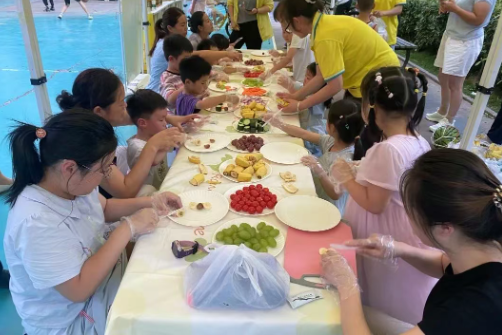 火龙果、葡萄、香蕉、圣女果等五颜六色的水果依次在桌上排开,小朋友们端着盘子自由挑选,一口爆汁的甜蜜瞬间驱散暑气。